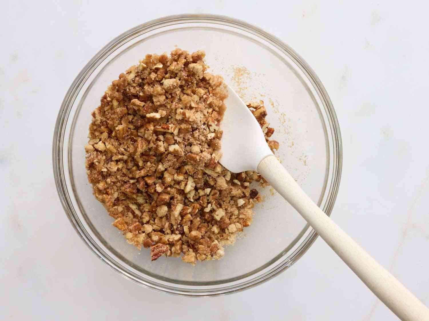 - Step 3:Make the topping: Mix pecans, white sugar, brown sugar, melted butter, cinnamon, and salt together in a mixing bowl until thoroughly combined and all components are coated with butter, 3 to 4 minutes. Dotdash Meredith Food Studios