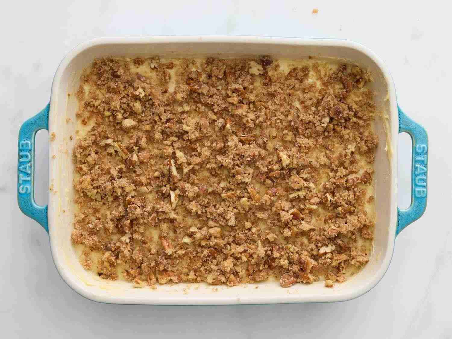 - Step 6:Spread 1/2 of the batter over the bottom of the prepared baking dish, then sprinkle with 1/2 of the topping. Carefully spoon remaining batter over topping, then sprinkle with remaining topping; very gently press topping into batter. Dotdash Meredith Food Studios