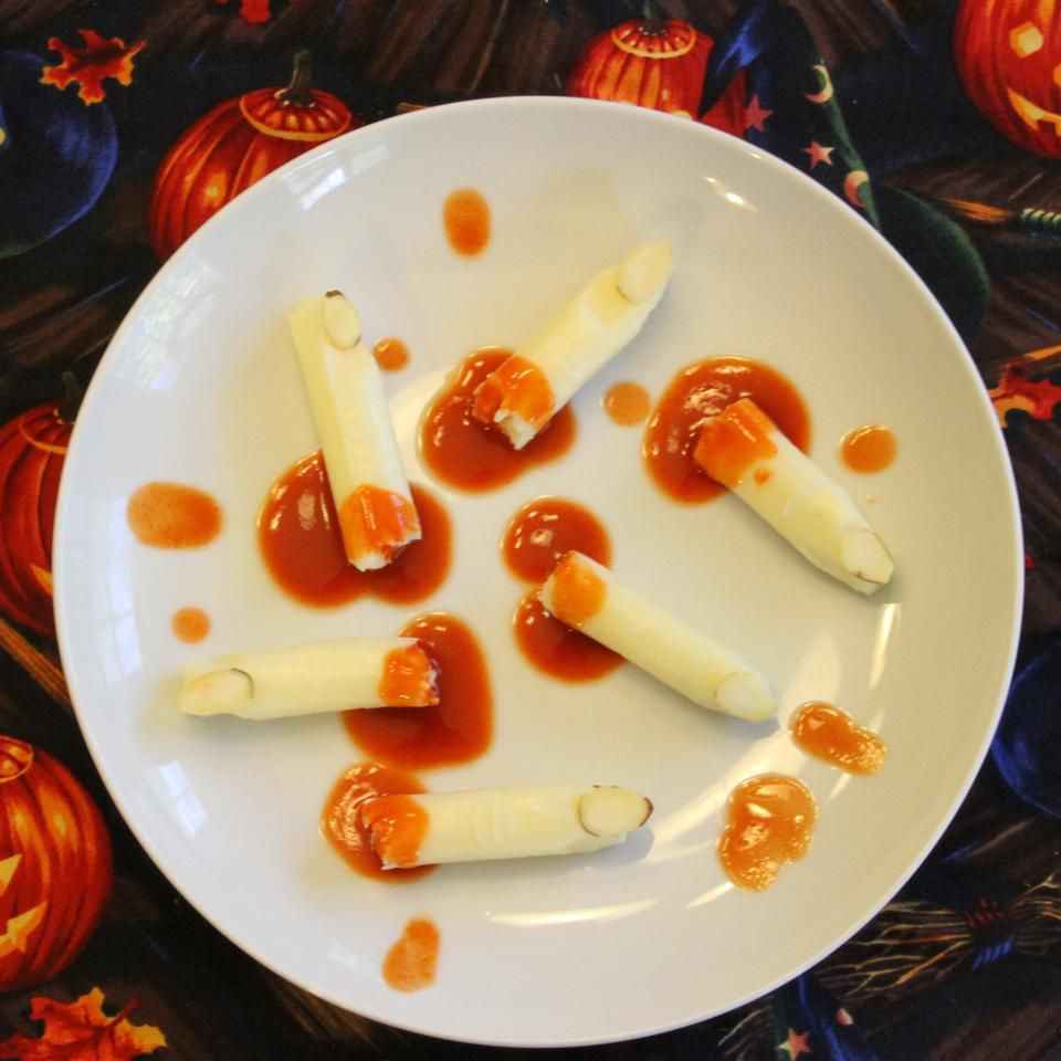 - Step 1:Round off the ends of each cheese stick with a paring knife to resemble a fingertip. Roughly tear each cheese stick in half to form two torn-off "fingers".